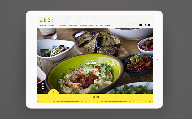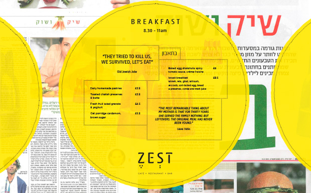 ZEST is the restaurant, café and bar at JW3. Hope’s challenge was to create an identity that reflected a strong Tel Aviv culinary tradition, full of sunlight, warmth, life and zest. The highly colourful crockery was the starting point for the colours and tones. From there we developed a logotype that reflected the Hebrew vowels. We wanted the menu design to stand out and intrigue the diner, so we printed the menu on old Israeli newspapers, and added some pearls of wisdom hidden in the text!